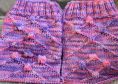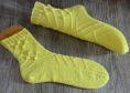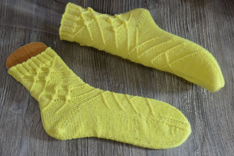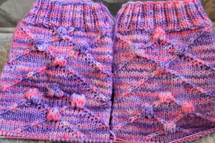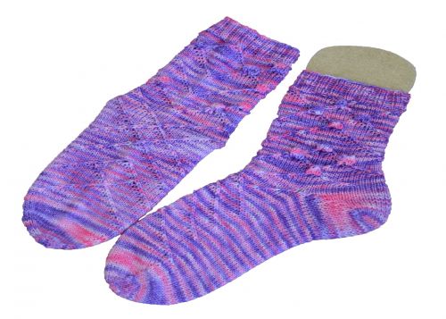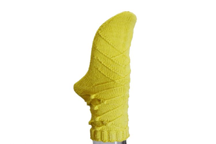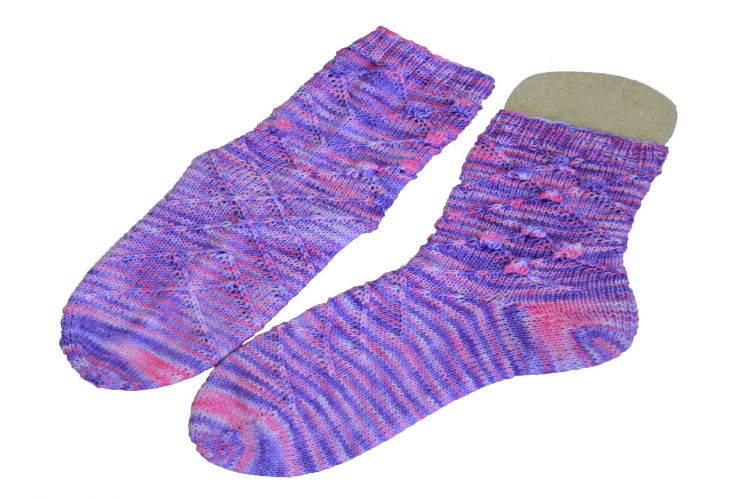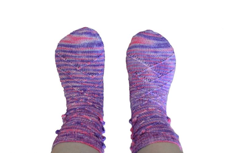 Die Socken werden von oben nach unten in Runden gestrickt. Sie enthalten verkreuzte Maschen und Noppen.
