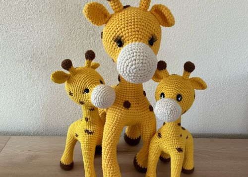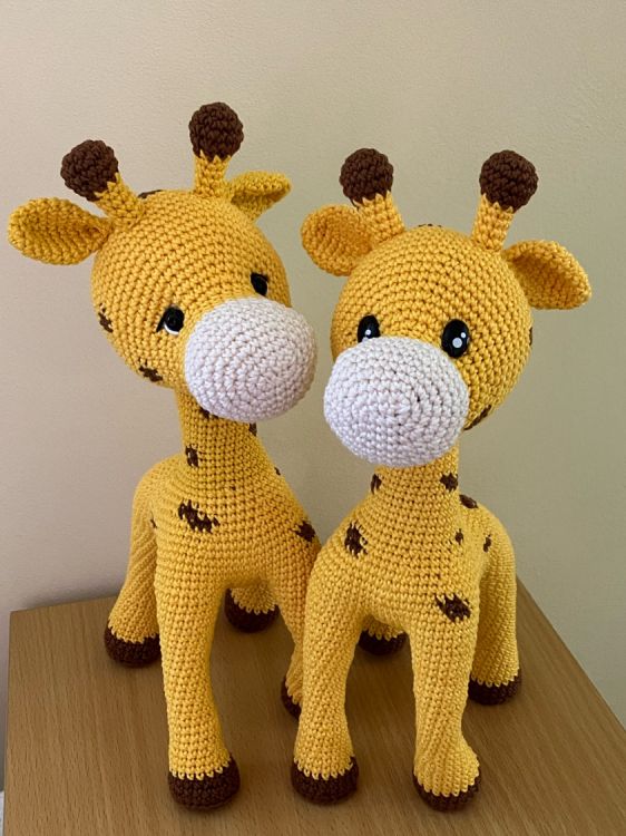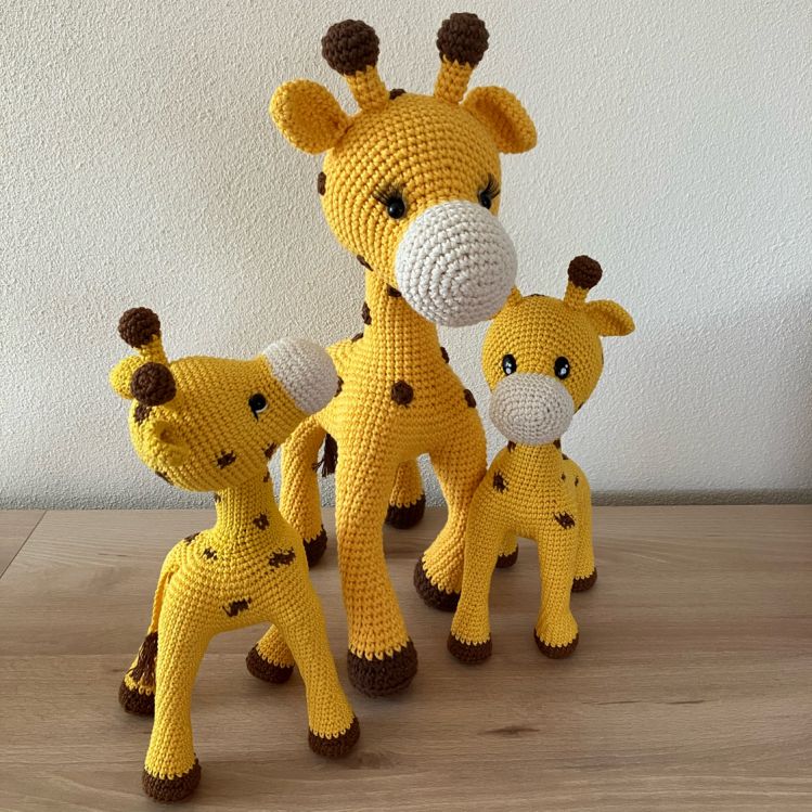 Auf den Bildern sieht du die Giraffen in zwei Größen. Es handelt sich dabei aber nicht um zwei Anleitungen sondern um dieselbe Anleitung. Die Giraffen wurden nur mit unterschiedlicher Wolle und Nadelstärke gehäkelt.