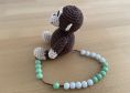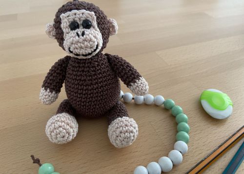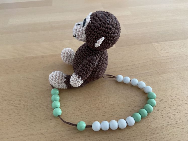 Benötigte Materialien: Reste Baumwollgarn in braun, hautfarben, schwarz, 1 Paar Sicherheitsaugen, 6 mm, 20 Holzperlen, 10 oder 12 mm (jeweils 10 von einer Farbe), Füllwatte, Häkelnadel Nr. 3, Schere, Nadel zum Vernähen und Zusammennähen