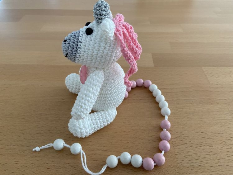 Benötigte Materialien: Reste Baumwollgarn in hellgrau, rosa, weiß, schwarz, Lurexgarn in silber, einen Knopf, z. B . Herz- oder Sternform
