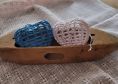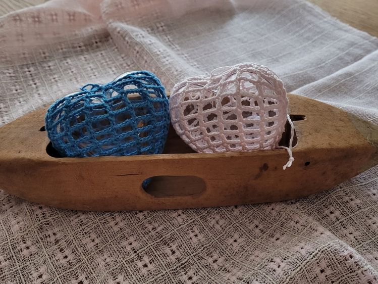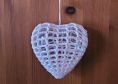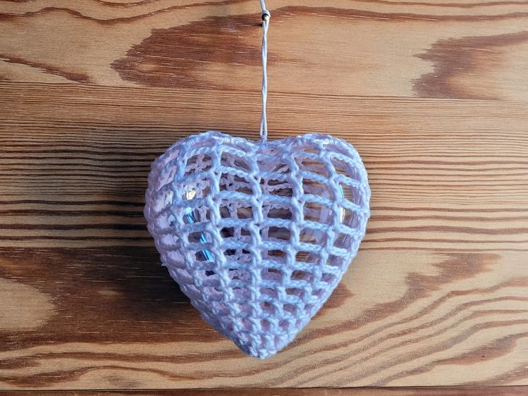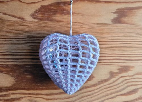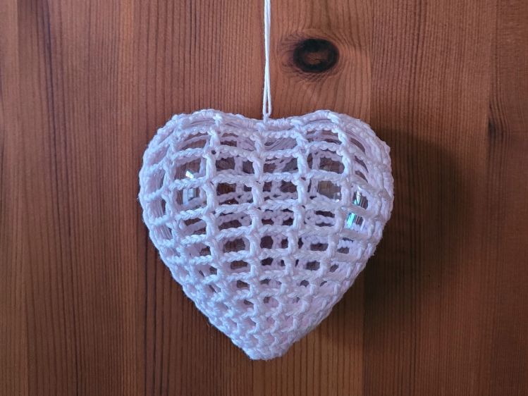 Du brauchst ein Acryl Herz, 8 cm hoch, dazu Reste eines dünnen Baumwollgarns und dazu die Häkelnadel Nr. 2,5.