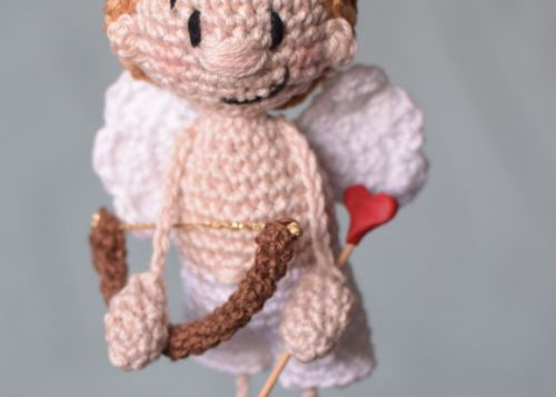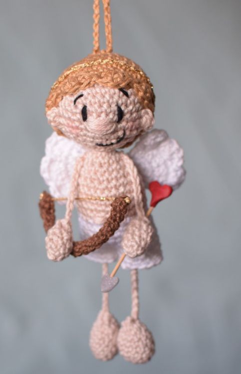 Die Anleitung ist auführlich beschrieben und mit viele Fotos bestückt. Mit Häkelnadel 2,5 und Baumwollgarn LL125/50g wird Amor ca 14,5 cm groß.