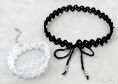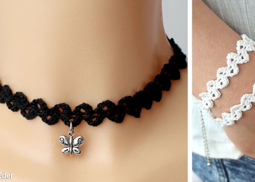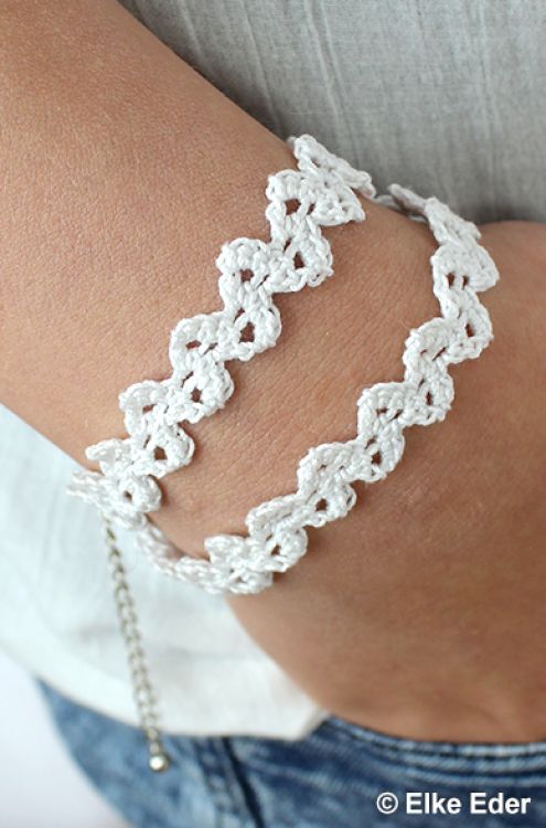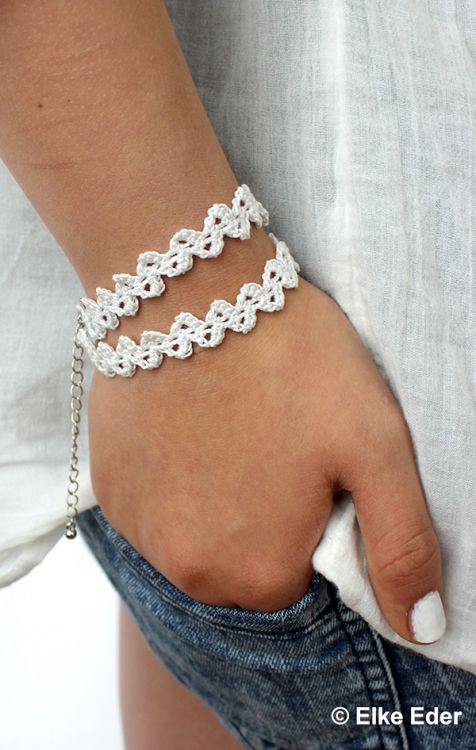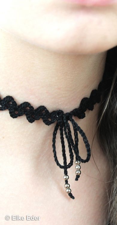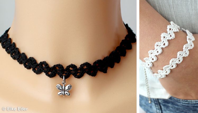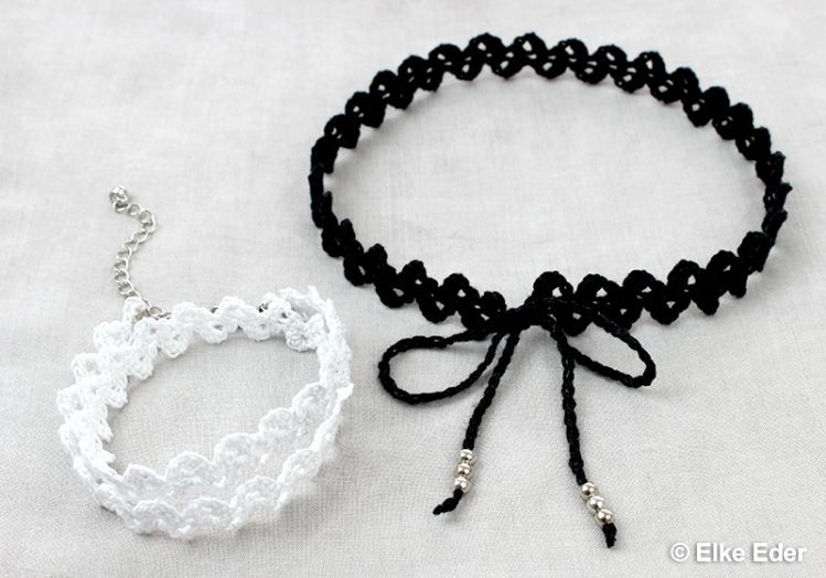 Material: Häkelgarn Anchor Aida bzw. Woll Butt Diana Stärke 10, Häkelnadel 2,0 mm, Nähnadel. Zusätzlich für Chocker: einige Großlochperlen, 5 mm Durchmesser. Zusätzlich für Armband: Klemmverschluss mit Verlängerungskettchen, 8 mm breit.