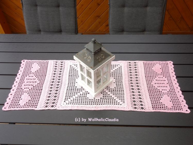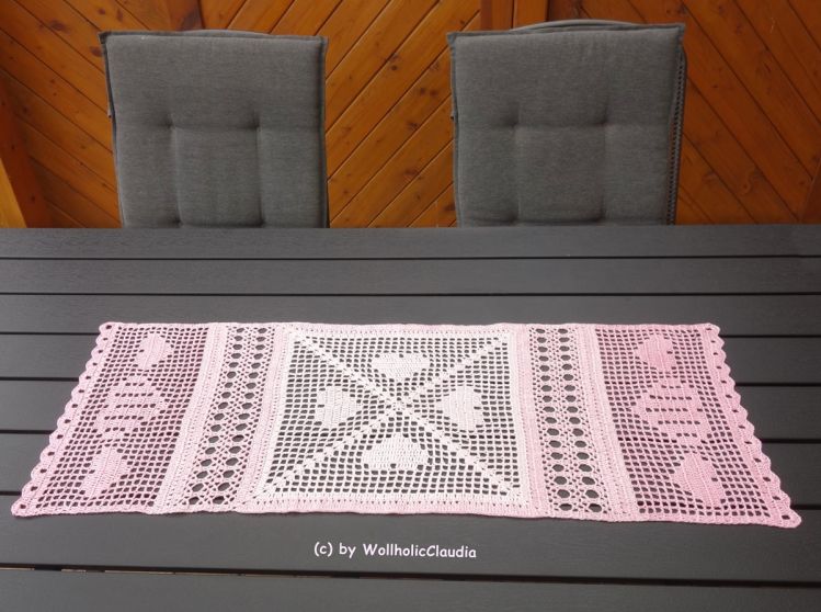 Dieser wunderschöne Läufer ist ein Mix aus Filethäkeln und dem herkömmlichen häkeln und macht nicht nur an Valentinstag oder Muttertag Freude.