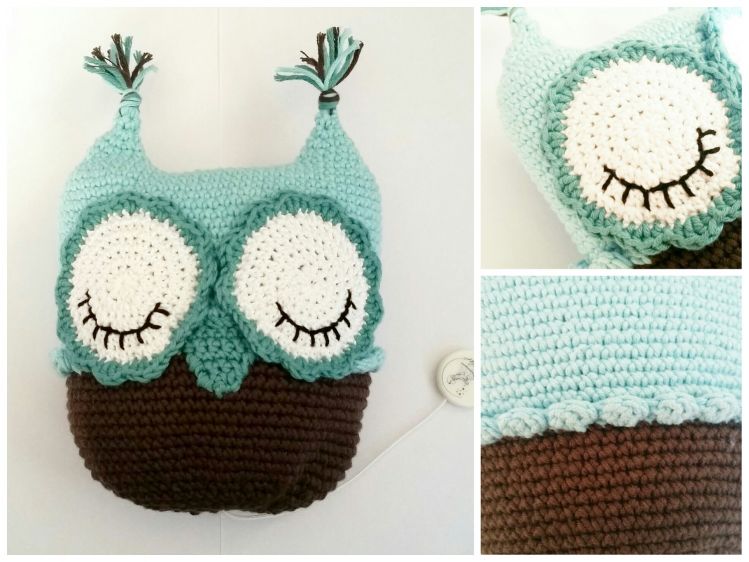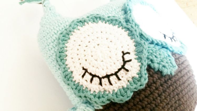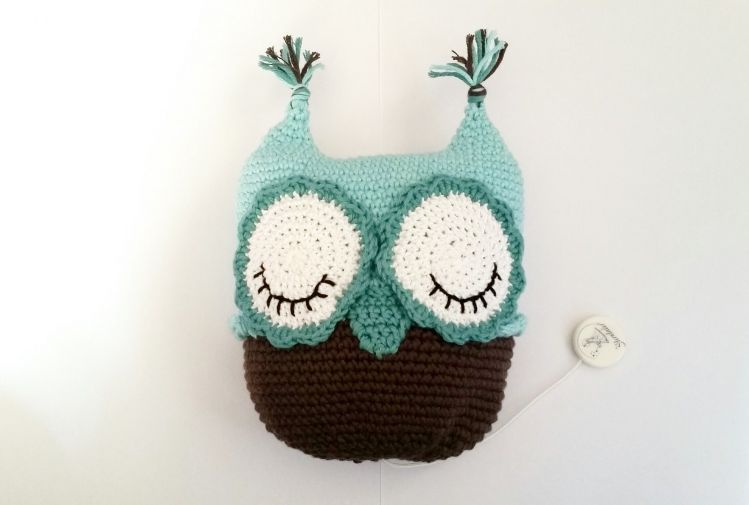ein Spielwerk (ohne Spielwerk habt ihr ein hübsches Eulen-Kissen, alternativ kann man auch ein Ü-Ei mit einer Perle drin oder ein Glöckchen einhäkeln)
