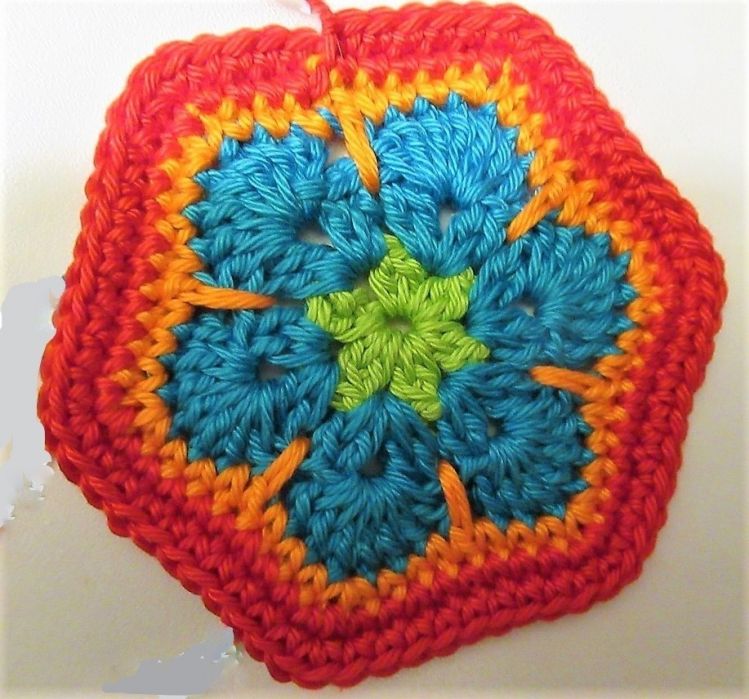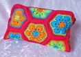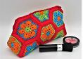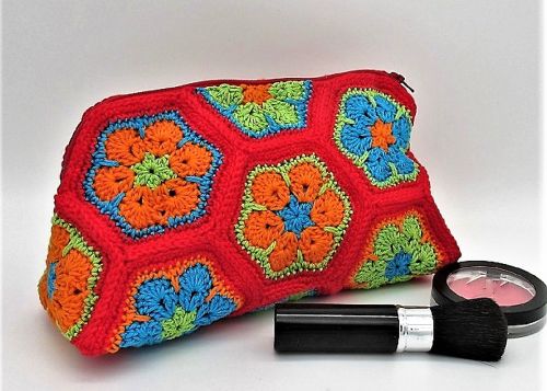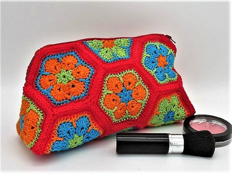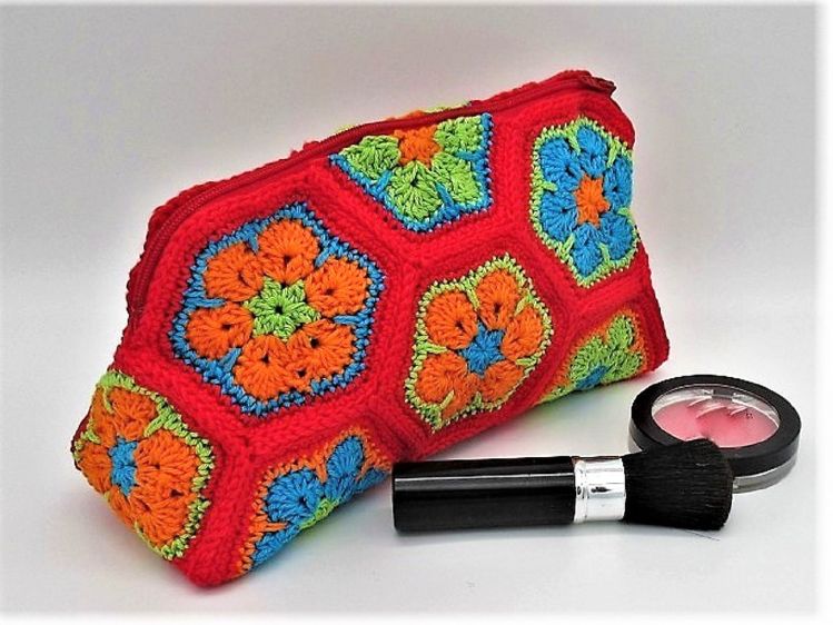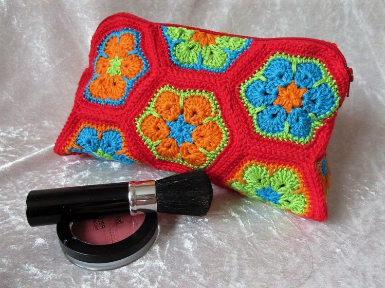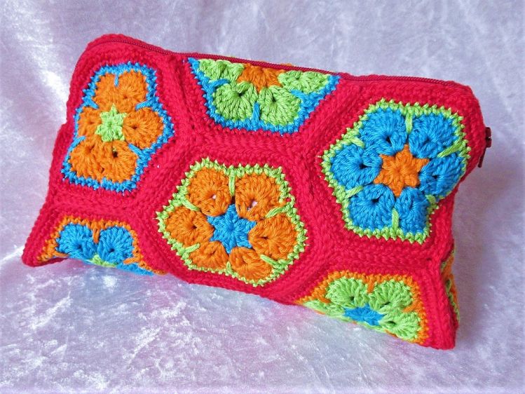 Für diese Kosmetiktasche kannst du sehr gut Wollreste verwenden. Sie besteht aus einzelnen Hexagonen mit Blumenmuster, sog. "African Flowers". Sie werden zuerst einzeln gehäkelt und dann miteinander verbunden.Das Täschchen wird mit einem reißverschluss geschlossen und ist etwa 20cm lang und 14 cm hoch.