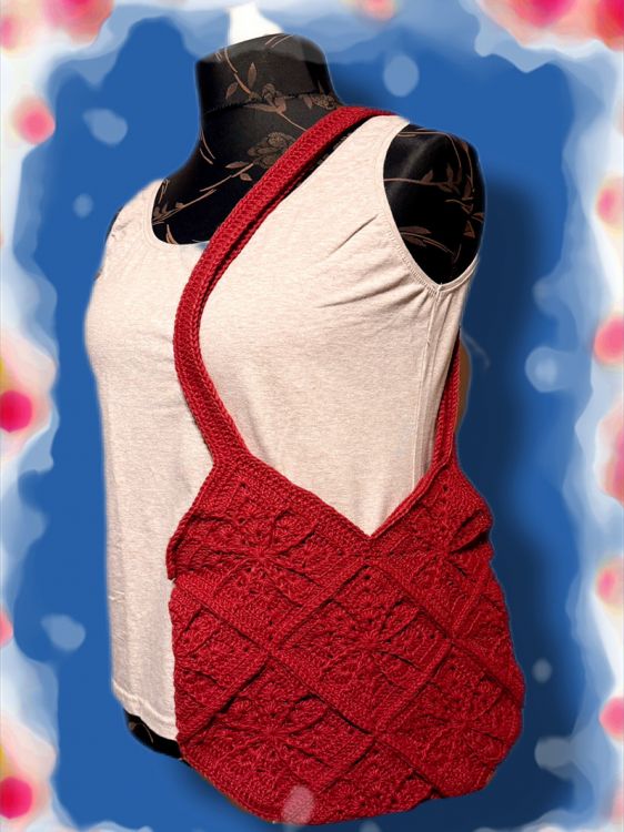 Die hier abgebildete Tasche hat eine Breite von ca. 30cm und eine Höhe von ca. 25cm (gemessen in der Mitte an der tiefsten Stelle). Die Länge der Träger ist variabel und wird durch die Menge der angeschlagenen Luftmaschen bestimmen.