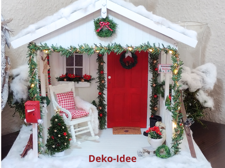 Die fertige Tür und das Fenster kannst du entweder an einer Wand in deiner Wohnung befestigen oder sie an die Wand des Miniatur-Gartenhäuschens kleben, um so eine kleine Veranda oder ein Wichtelhäuschen zu gestalten.