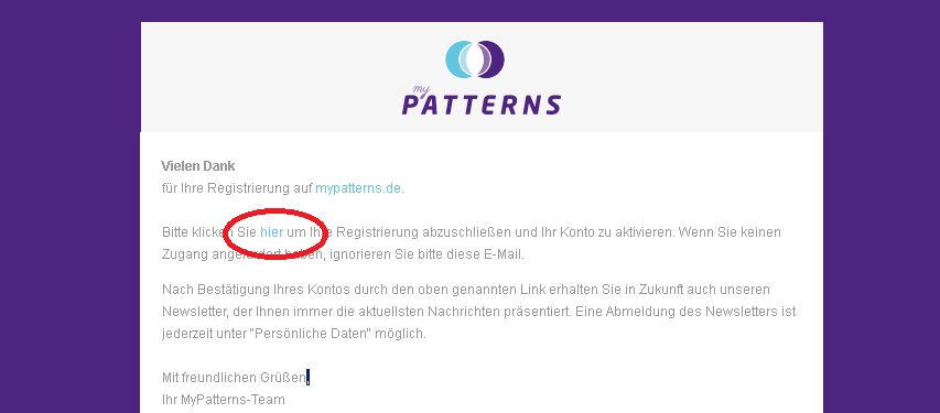 Nachdem du auf "Registrieren" geklickt hast, bekommst du von uns eine E-Mail. Den Registrierungsvorgang schließt du erfolgreich ab, in dem du im E-Mail auf "hier" klickst.
