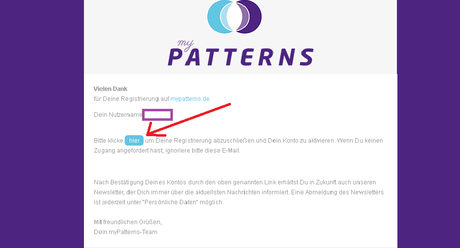 Das eine Anmeldung nicht funktioniert, liegt am häufigsten daran, dass die Registrierung nicht richtig abgeschlossen wurde. Nach der Anmeldung erhälst du eine E-Mail, in der du aus Sicherheitsgründen deine E-Mail-Adresse bestätigst. In dieser E-Mail steht auch noch einmal dein Benutzername geschrieben. Achte daher darauf, dass die E-Mail-Adresse in der Anmeldung richtig angegeben wurde, da sonst diese Bestätigungse-Mail nicht zugestellt werden kann. In diesem E-Mail klickst du auf "hier". Danach wirst du an myPatterns weitergeleitet und der Registrierungsvorgang ist abgeschlossen.