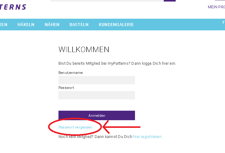 Wenn du bereits bei myPatterns registriert bist, benötigst du zum Einloggen nur deinen Benutzernamen und das Passwort. Bei beiden wird auf die Groß-/Kleinschreibung geachtet. Sollte das Passwort 3 Mal falsch eingegeben worden sein, sperrt sich das Benutzerkonto aus Sicherheitsgründen für 5 Minuten. Danach kannst du das Passwort neu probieren.