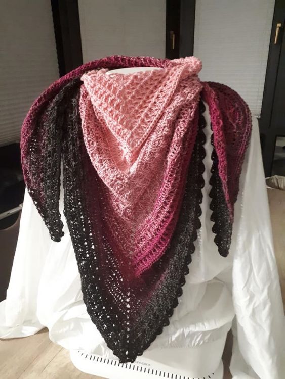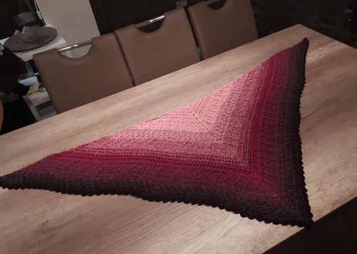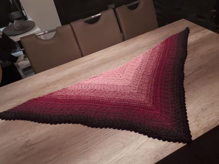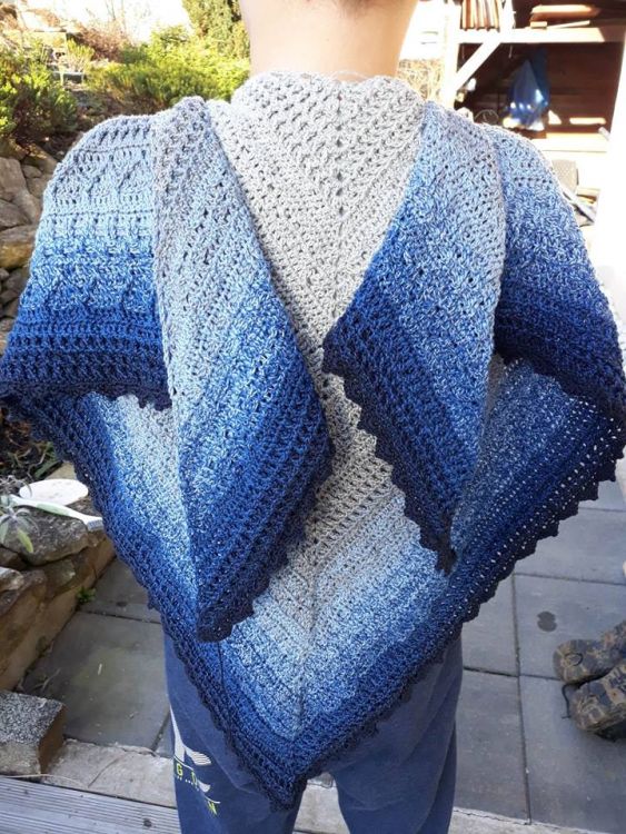 Ich habe einen Farbverlaufsbobbel in 4 fädiger Stärke und 1000 lm verbraucht, Gearbeitet habe ich mit Nadelstärke 4. Das Tuch ist aber erweiterbar.