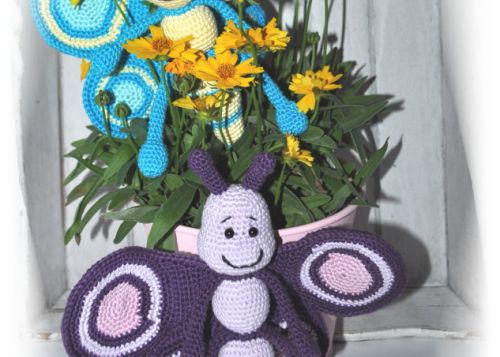 Hier kommt Schmetterling Betty angeflogen auf der Suche nach dem Sommer. Du kannst Dir Deinen Schmetterling in so vielen bunten Farben häkeln wie Du magst. Bei Verwendung des angegebenen Materials wird Betty ca. 19cm lang und 22cm Breit (mit Flügelspannbreite). Für Betty benötigst Du ca. 100g Baumwollgarn (125m/50g) von 1 Farbe mindestens 50g (Körper). Anstonsten noch etwas Füllwatte, ein paar Sicherheitsaugen und natürlich Nadel und Schere.