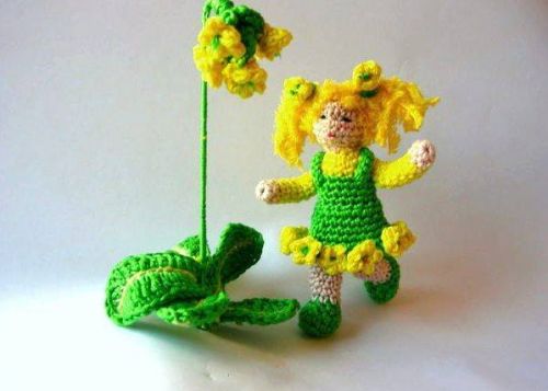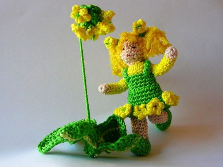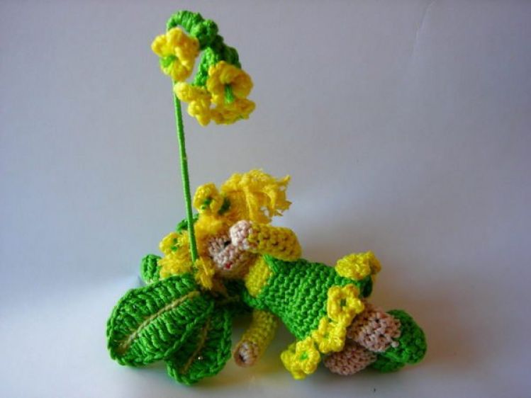 Das Schlüsselblümchen ist ein besonders fröhliches Blumenkind. Es tanzt den ganzen Tag auf der Wiese und am Waldrand um seine Blume herum und freut sich über die ersten wärmenden Sonnenstrahlen. Das kleine Püppchen wird aus festen Maschen gehäkelt und wird etwa 15 cm groß. Es hat bewegliche Arme und Beine, so dass du es in verschiedenen Positionen dekorieren kannst. Es passt gerade jetzt im Frühling besonders gut auf deinen Jahrezeitentisch. Zum Nachhäkeln genügen Wollreste.