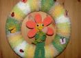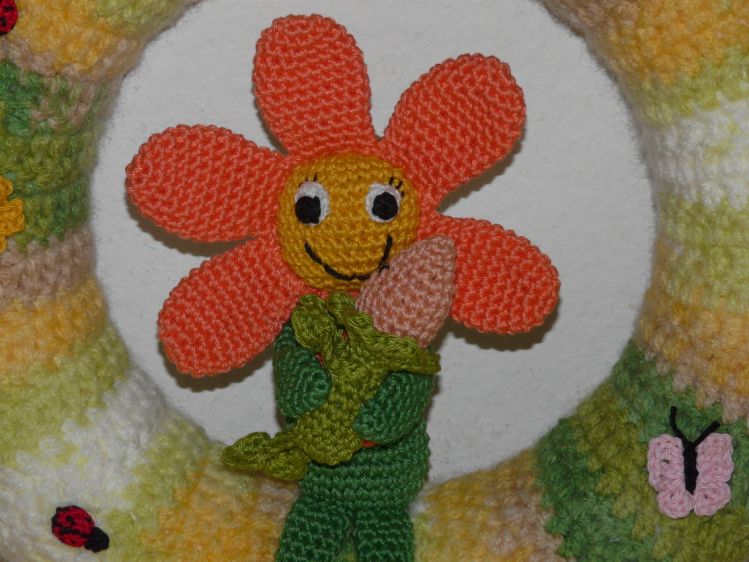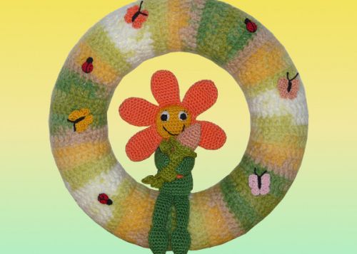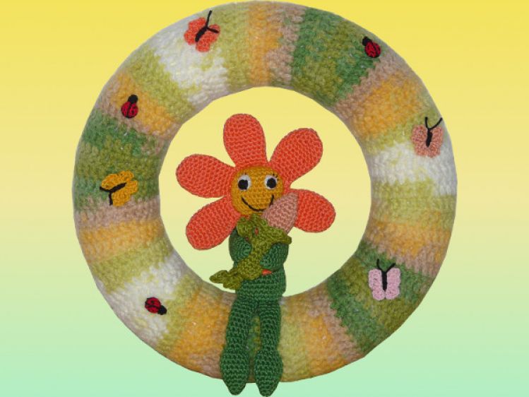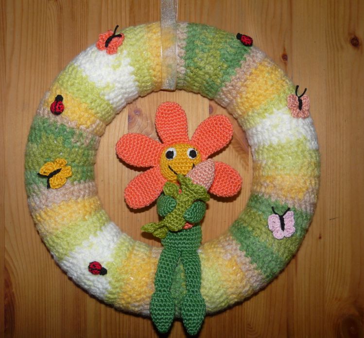 Je nach Garn- und Häkelnadelstärke variiert die Größe von der Blume, der Knospe, den Schmetterlingen und den Käfern. Nur der Kranz sollte mit einer Wolle für Häkelnadel Nr. 5 gehäkelt werden, damit er auch um den Styroporkranz passt.