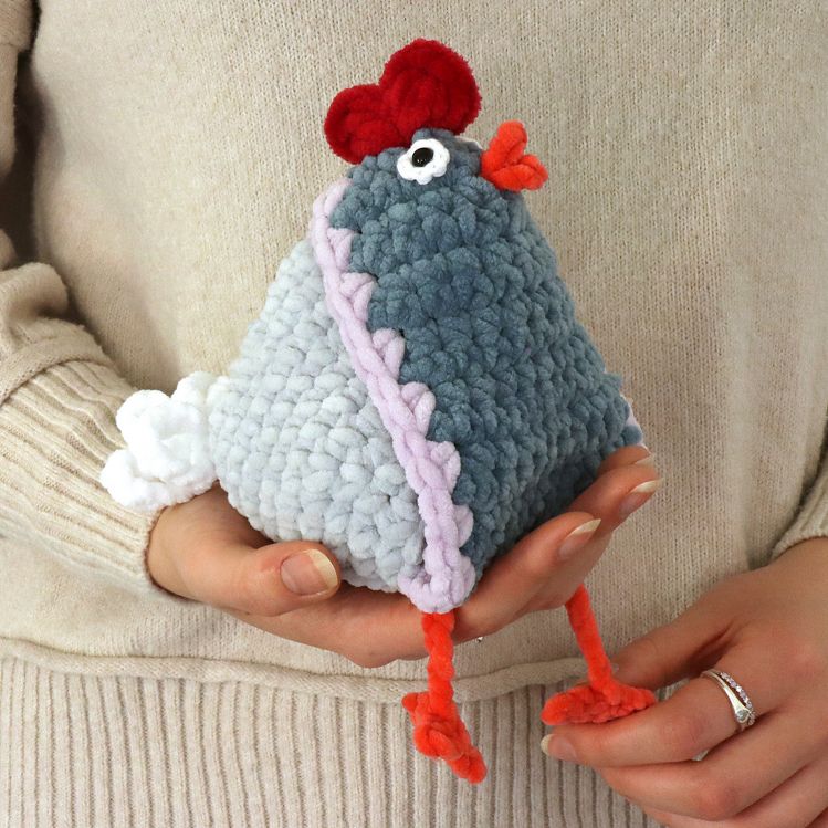 Ei wunderbares Wochenend- ober Abendprojekt. Der Körper wird mit festen Maschen gehäkelt, die Schwanzfedern und der Kamm werden direkt an den Körper gehäkelt. Die Beinchen sind zusammenhängend und werden mit eingearbeitet. So musst du am Ende lediglich den Schnabel anbringen und eine Naht schließen, ansonsten ist kein Annähen nötig (außer 1 Knopf).