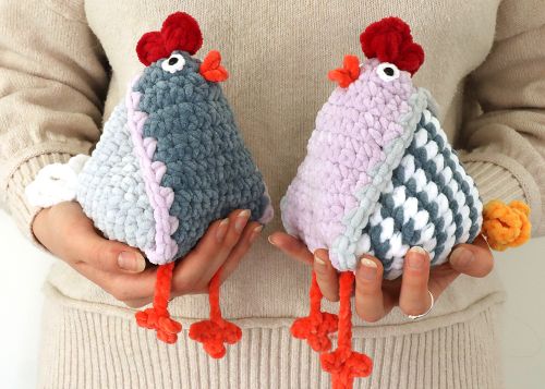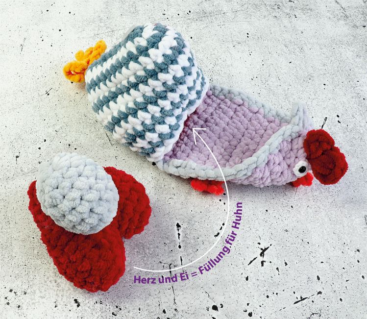 Die Anleitung umfasst das Huhn in zwei Varianten - mehrfarbig gestreift oder mehrfarbig ohne Streifen. Dazu gibt es die Anleitung das Herz und das Ei.