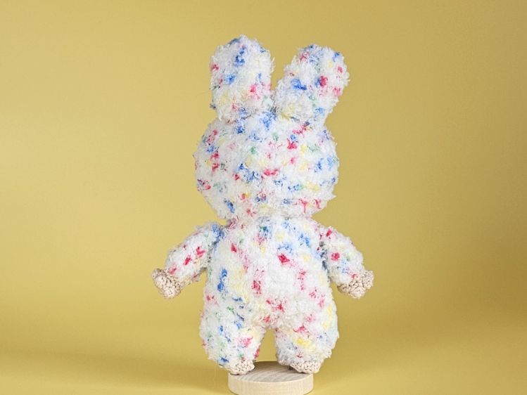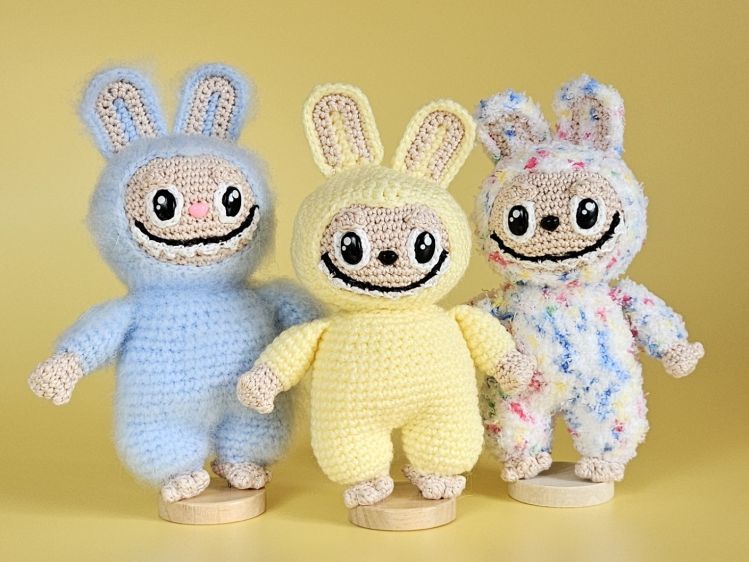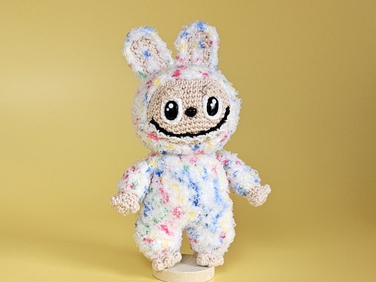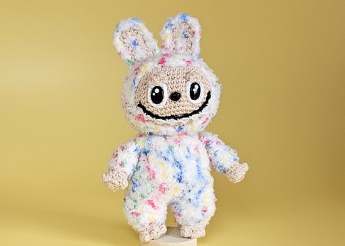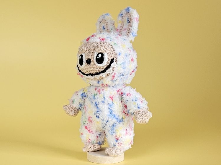 Mit seinem breiten Grinsen und den großen Augen ist Boo Boo ein ganz besonderer Blickfang. Er trägt einen flauschigen Anzug in bunten Pastellfarben mit langen Hasenohren und strahlt dabei pure Lebensfreude aus. Boo Boo ist ein außergewöhnliches Häkelprojekt für alle, die es verspielt und fröhlich mögen.