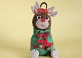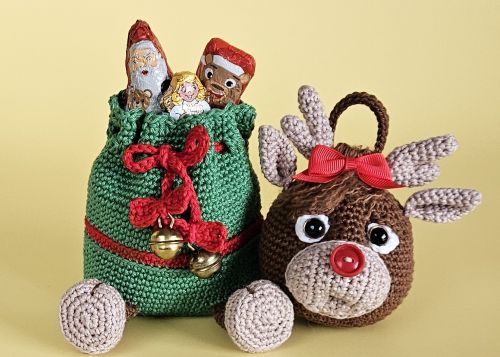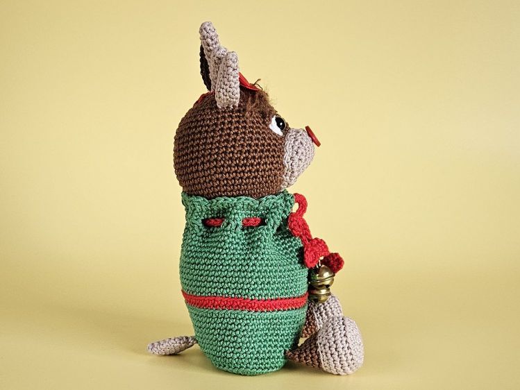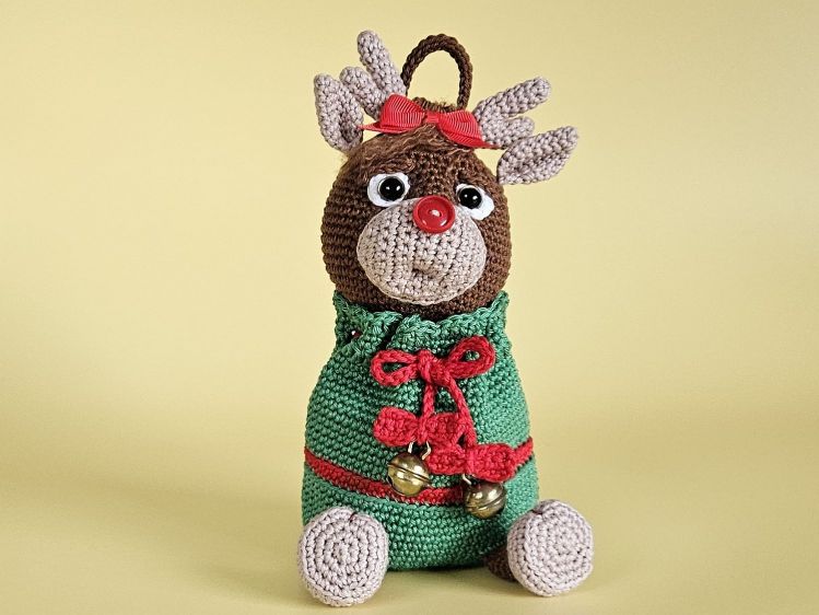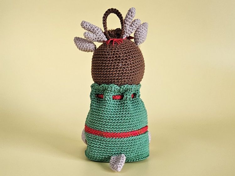 Das grüne Säckchen bietet Platz für kleine Geschenke oder Leckereien und wird durch ein rotes Band mit Glöckchen und roten Schleifen verschlossen. Besonders niedlich: aus dem Säckchen schauen die niedlichen Beine hervor. Das Rentier, geschmückt mit einer roten Schleife und einer witzigen Knopf-Nase, schielt leicht und dies verleiht ihm somit einen frechen Ausdruck. Der Clou: Der Kopf kann auch als Christbaumkugel verwendet werden und sorgt so für doppelte Freude – ob als Deko oder kleines Mitbringsel.