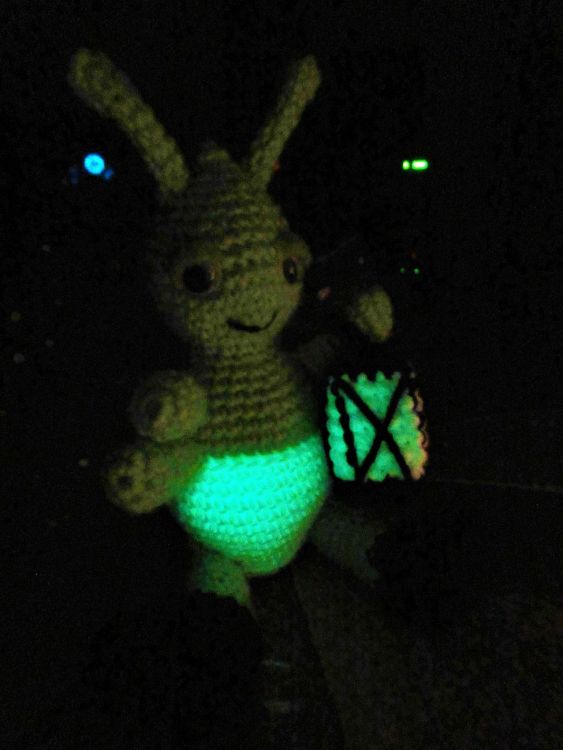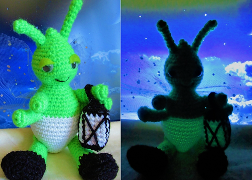 Für Glühwürmchen Günther wird phosphoriszierendes (selbstleuchtendes) Garn verwendet. Wenn man es einige Zeit an einer Lichtquelle auflädt, leuchtet es im Dunkeln. Das Garn ist ungiftig, speichelfest und auch für Kinder geeignet.