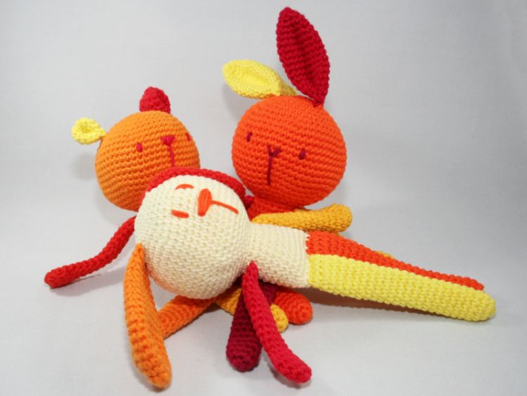 Ohne Ohren sind die Figuren ca. 26 cm groß (mit 3.0 mm Nadel und z.B. Puppets Lyric 8/8 Garn oder doppelt genommener Catania Originals).