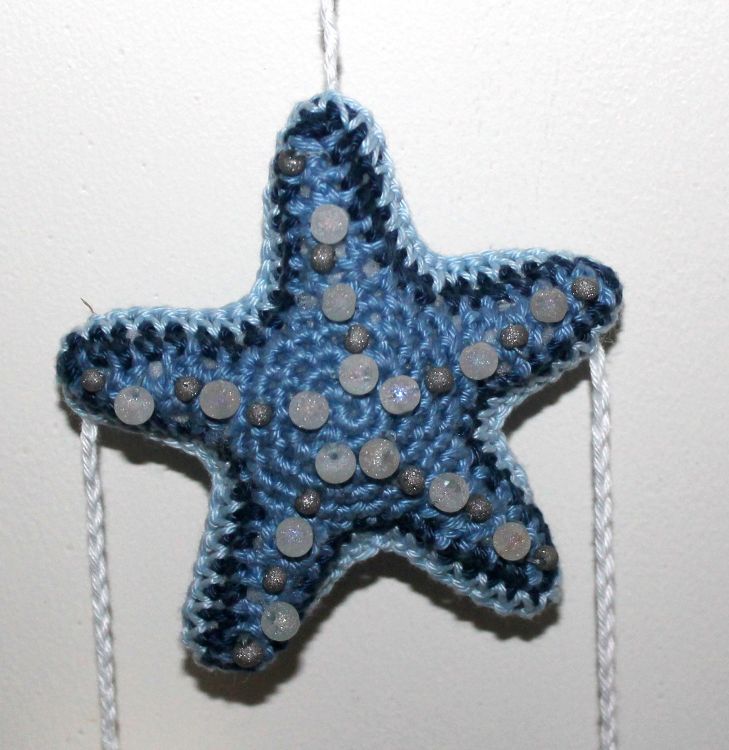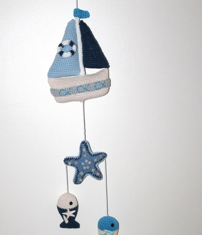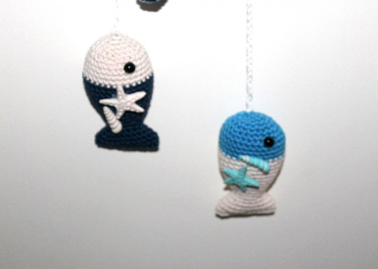 Diese schöne verspielte und maritime Deko kann wunderbar als Mobile, aber auch in einzel Teilen gehäkelt werden. Sie kann so also als Mobile fürs Kinderzimmer, oder auch als Badezimmer, oder Balkondeko gehäkelt werden.