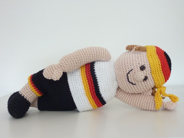 Steffen Stürmer wird, unter Verwendung des angegebenen Materials, 29 cm hoch. Ich persönlich empfehle für das Nacharbeiten all meiner Amigurumis und Kuscheltiere Baumwollgarn.
