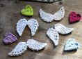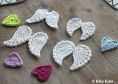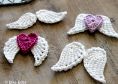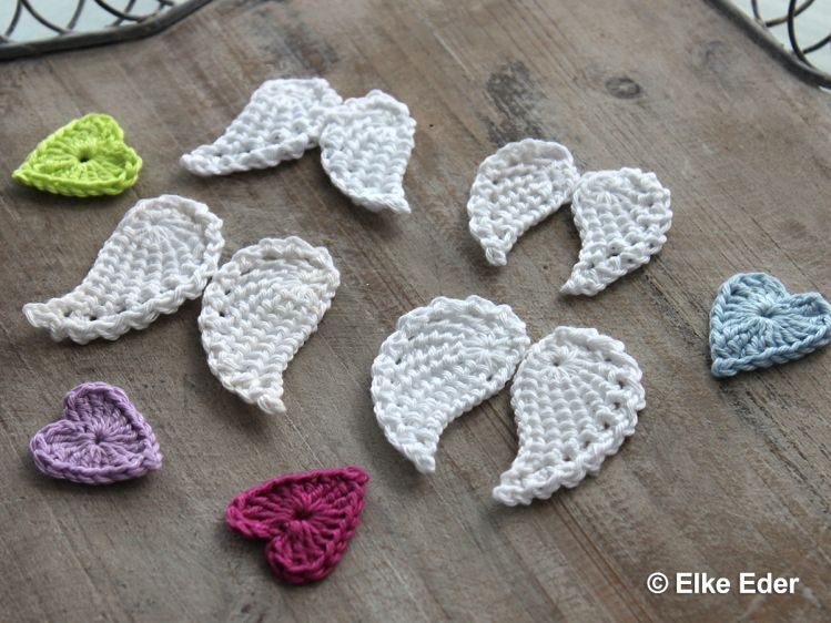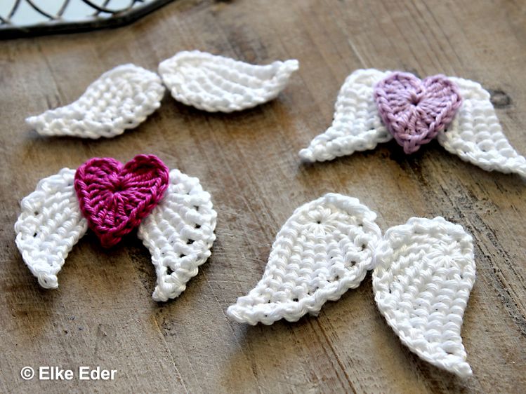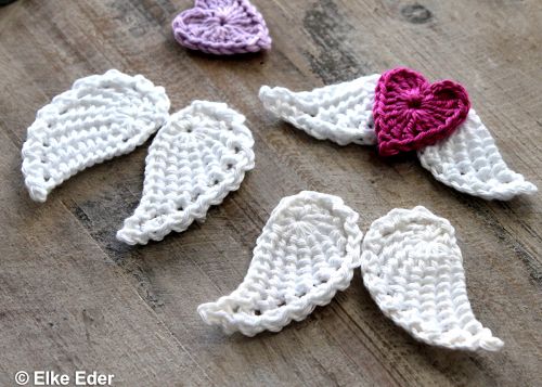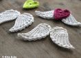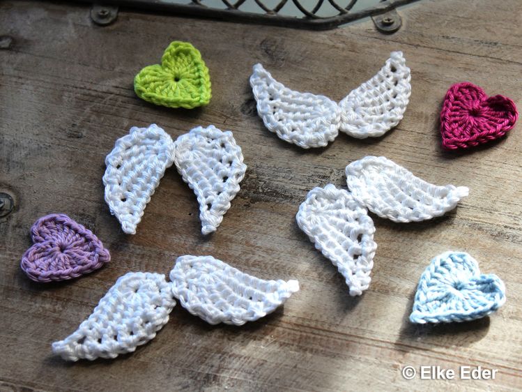 Die Flügel wurden mit Catania und Nadelstärke 2,5 mm gehäkelt. Sie sind 5 cm bzw 6 cm groß. Nötige Vorkenntnisse: Luftmasche, Kettmasche, feste Masche, halbes Stäbchen für die Flügel sowie Stäbchen, Doppel- und Dreifachstäbchen für das Herz.