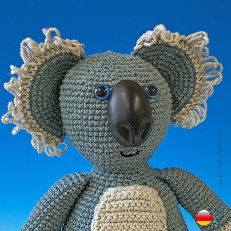 Zusätzliches Material: Sicherheitsaugen 12mm, Sicherheitsnase Koalabär 48mm, Füllwatte, schwarzes Garn um den Mund auf zu sticken