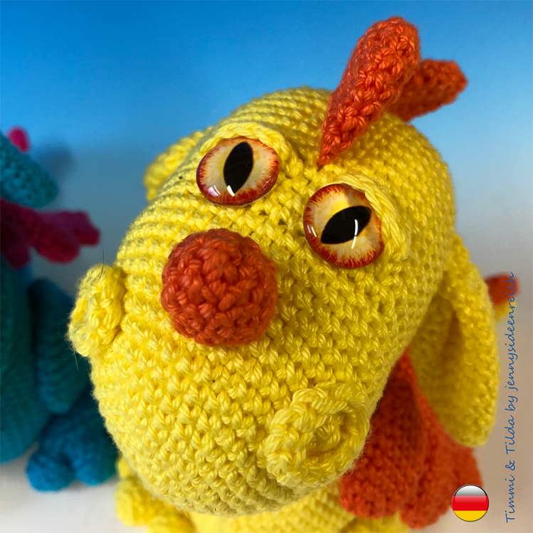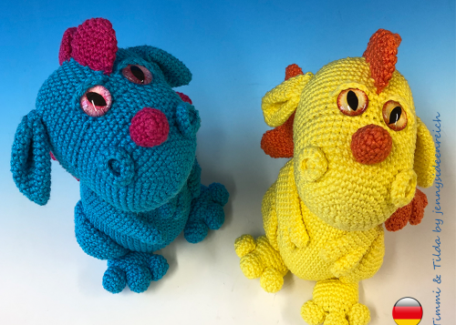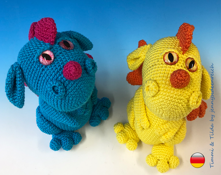 Ihr könnt hier die komplett ausformulierte Häkelanleitung zu Timmi und Tilda den Drachengeschwistern erwerben Sie ist 16 Seiten lang und besteht aus Texten und Bildern zu allen Einzelteilen.