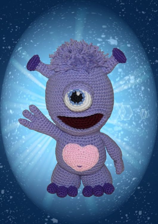Hallo! Ich bin Simo vom Planeten Wollis. Ich bin ein kleines liebes Alien das gerne kuschelt. Wenn ich Euch gefalle dann würde ich mich riesig freuen wenn Ihr Lust habt mich nach zu häkeln, damit ich auch bald mit Euch kuscheln darf:)