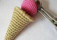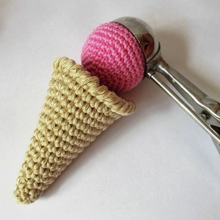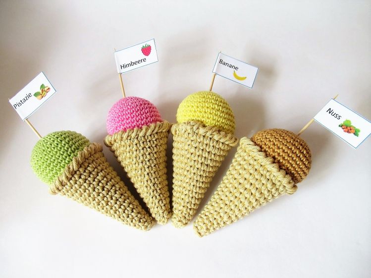 Zum Eidiele spielen: viele gehäkelte bunte Eiskugeln und Waffelhörnchen, und als "Reklameschild" das Amigurumi "verliebte Eisbällchen", das man auch sehr gut zum Valentinstag verschenken kann. Ein einfaches Projekt, für das man kleine Wollreste aufbrauchen kann.