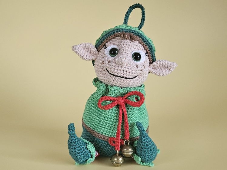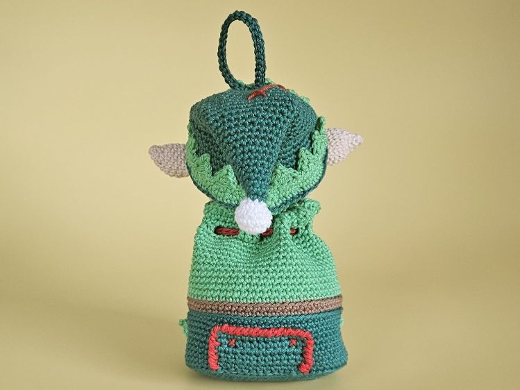 In fröhlichen Grüntönen mit roten und weißen Akzenten ist dieser Elf ein echter Hingucker. Mit seinem breiten Grinsen und den niedlichen Sommersprossen bringt er jeden zum Lächeln. Aus dem Säckchen schauen freche kleine Elfenschuhe hervor, und der Hosenlatz auf der Rückseite macht das Design besonders charmant. Ein rotes Band mit zwei kleinen Glöckchen rundet das Ganze ab.