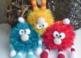 Benötigtes Material: bunte Wolle, 50g Fransenwolle, Häkenlnadel, schwarze Halbperlen und Füllwatte. Wuschel wird mit Nadelstärke 4 und 3, mit Fransenwolle und Catania-Baumwolle etwa 16 cm groß.