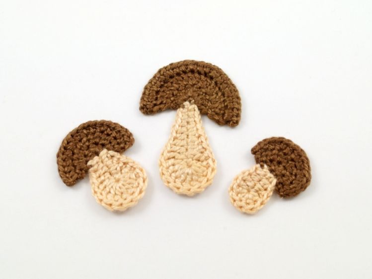 Mit Wolle Lauflänge 125 m / 50 g werden die Pilze ca. 3,5, 4 und 6,5 cm hoch;
