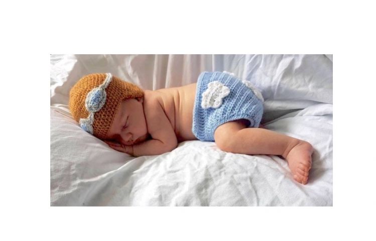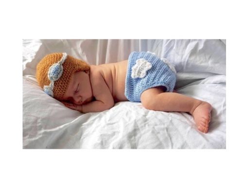 -Wolle: Wollstärke 5-6 (Verbrauch ca. 50-100 g in Braun für die Mütze, ca. 100g in Hellblau für das Windelcover, Reste in Weiß für die Wolken und Reste in Grau und Hellblau für die Brille )