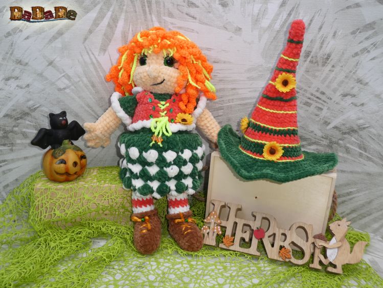 Natürlich ist die Hexe auch ein Püppchen, dass außerhalb von Halloween gerne in den Arm genommen wird