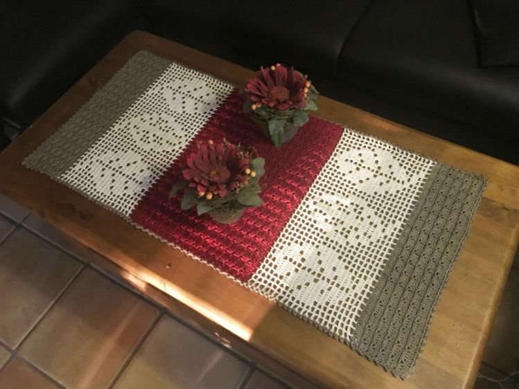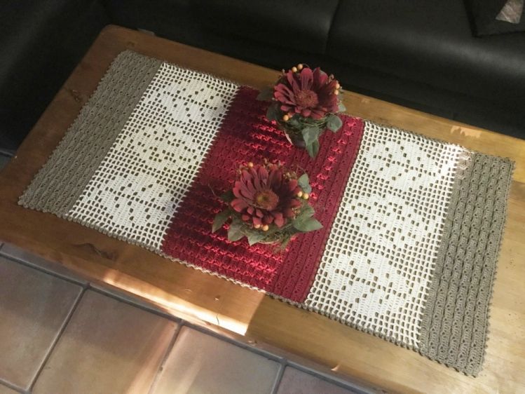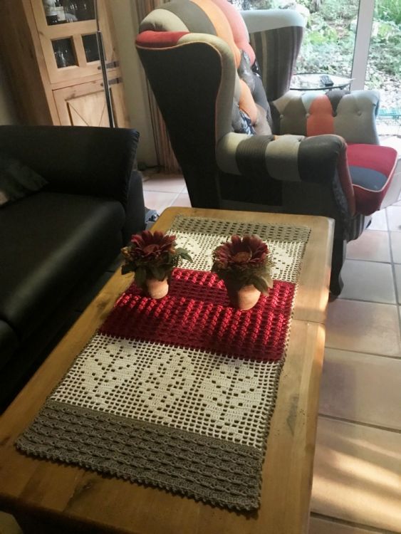 Der Tischläufer hat bei mir die Maße, mit angegebener Wolle und Nadel von: ca. 93 x 43 cm