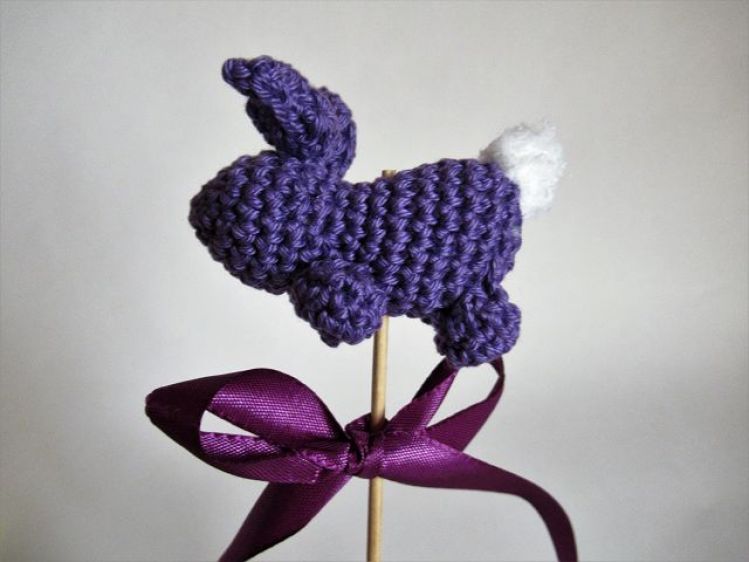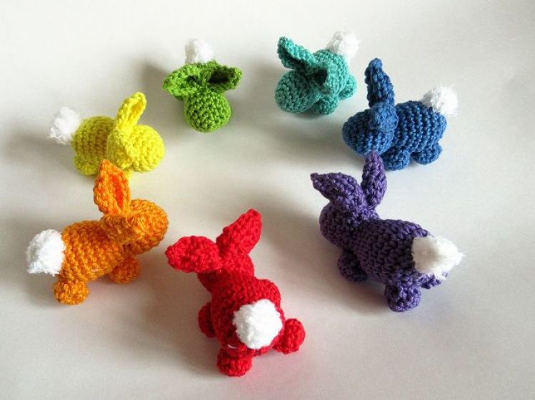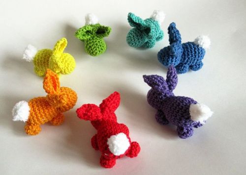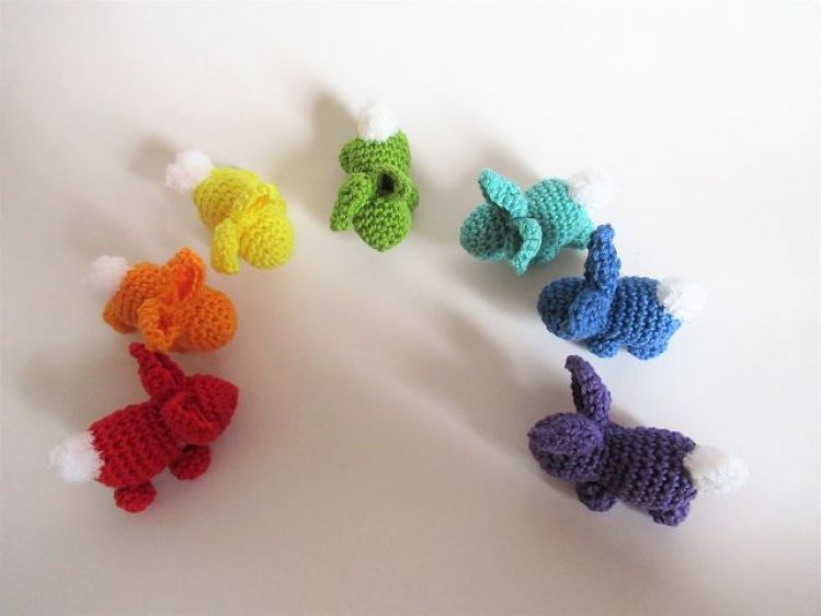 Diese Häschen kannst du aus winzigen Wollresten (am besten Baumwollgarn) in vielen bunten Farben nachhäkeln. Sie eignen sich toll als Anhänger für den Osterstrauch, als Blumenstecker, Tischdekoration oder Beigabe zum Osternest.