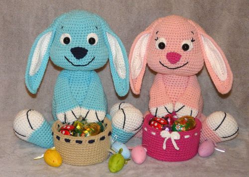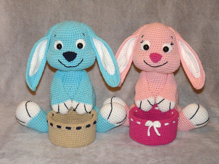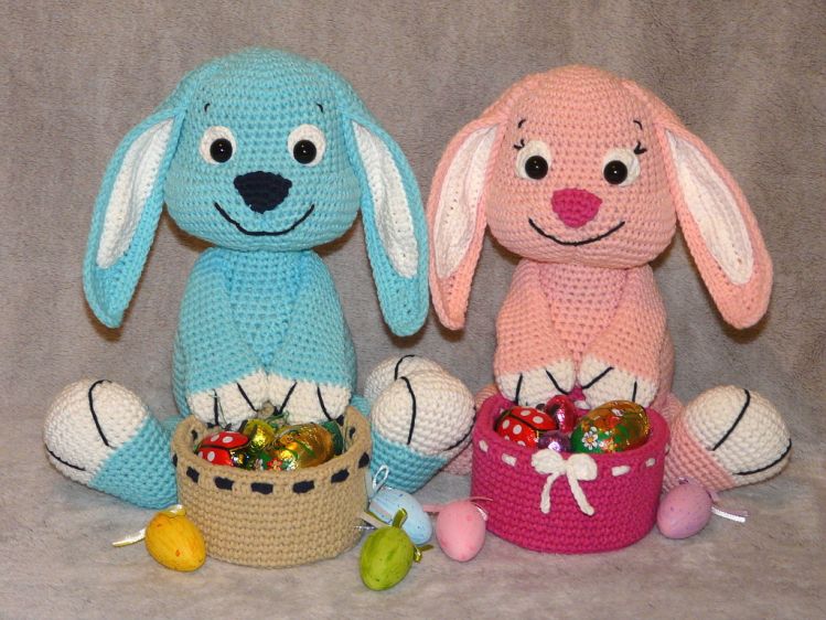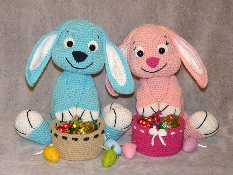 Obwohl meine Kinder schon etwas älter sind, freuen sie sich jedes Jahr auf ihren gefüllten Osterkorb. Und für dieses Jahr wollte ich etwas ganz Besonderes für die beiden häkeln. Dabei heraus gekommen sind diese beiden süßen Häschen mit Osterkorb. Der Korb wird von den Häschen fest gehalten und kann mit Süßigkeiten, Gutscheinen oder vielen anderen Kleinigkeiten befüllt werden.