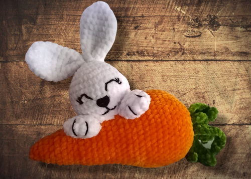 je nach der verwendeten Wolle wird der Hase mit der Karotte ca. 15 (Scheepjes Cahlista) bis ca. 22cm (Himalaya Dolphin Baby)