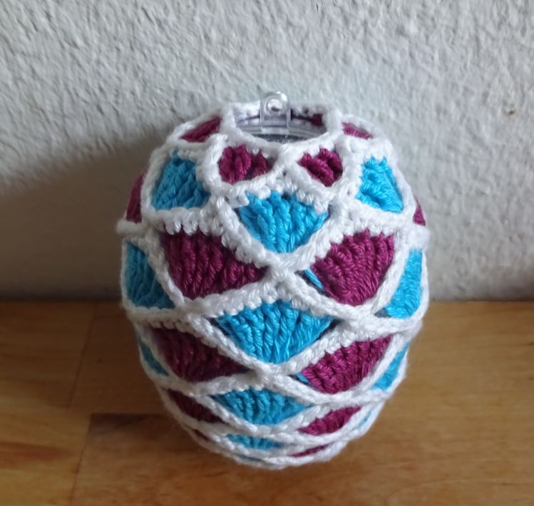 Das Ei wird um ein bestehendes Acryl- Ei herum gehäkelt. Es ist 10 cm hoch.