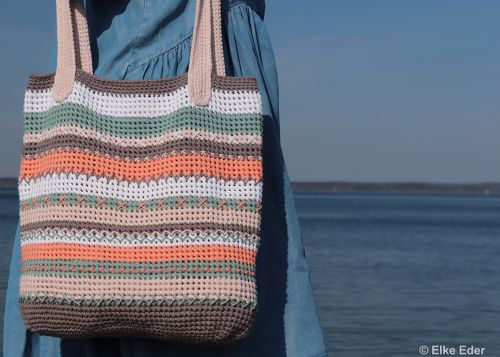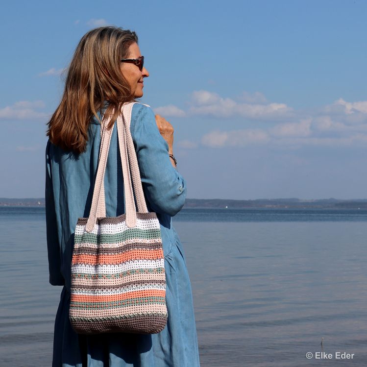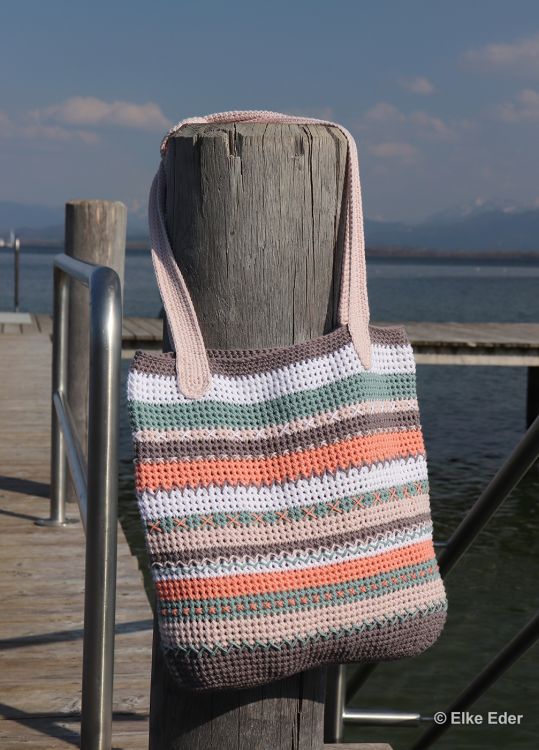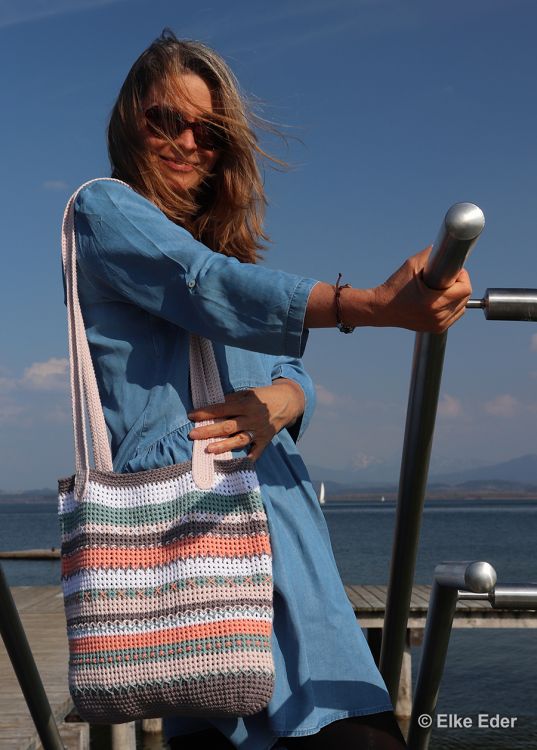 Ausführliche Beschreibung als PDF-Datei mit Häkelschrift für den Taschenboden und die Träger, Text und einige Arbeitsschrittfotos. Die Doppelmasche und die Stickstiche werden natürlich erklärt.
