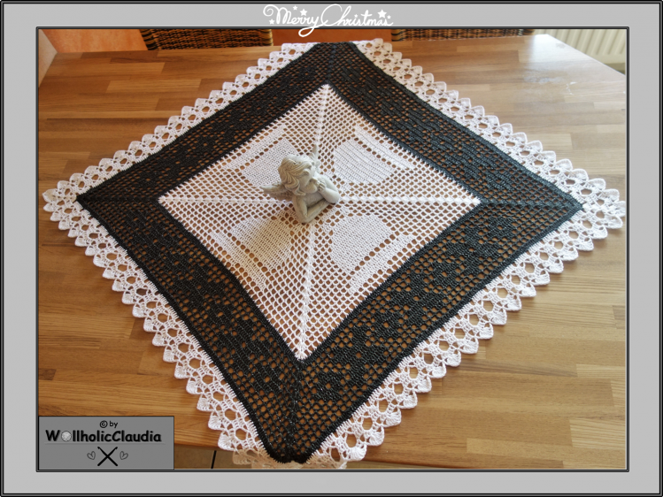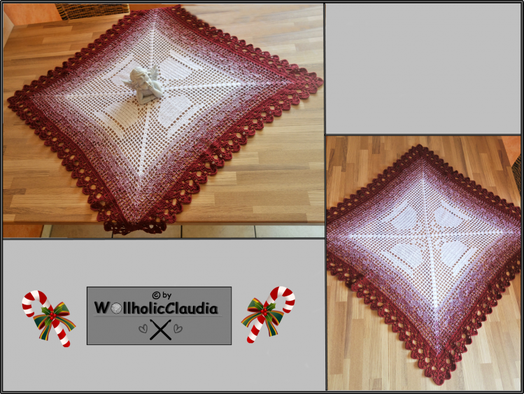 Diese wunderschöne Mitteldecke namens "Christmas-bells" verleiht jedem Tisch zur Weihnachtszeit einen festlichen Flair. Bei angegebener Garn- und Nadelstärke ist die Tischdecke ca. 100 cm x 100 cm groß.