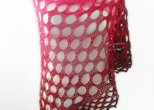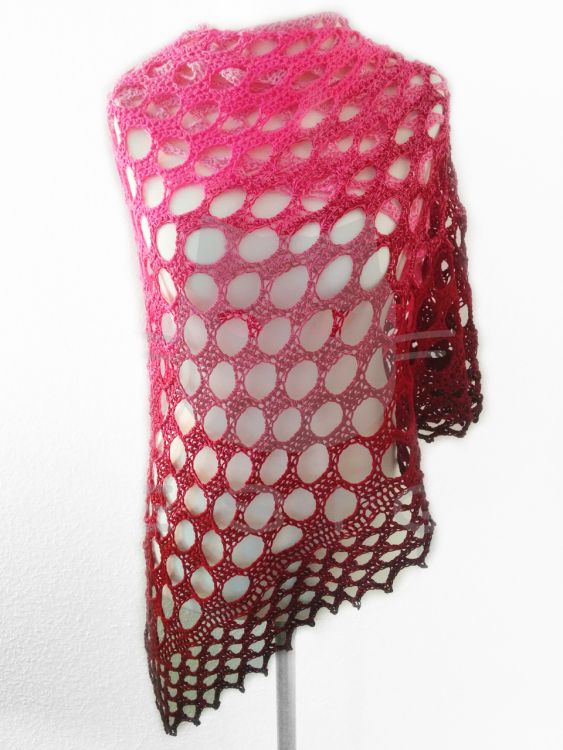 Das Tuch wird an einer Ecke begonnen und durch Zu- und Abnahmen definiert. Material: 760m 4fach Verlaufsgarn Nadelstärke: 5,0mm 5,5mm