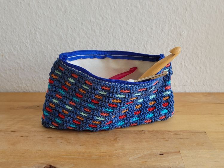 Ein buntes Täschchen für alle Fälle zum Aufbewahren von Häkelnadeln und anderen Kleinigkeiten. Selbst gehäkelt im angesagten Mosaikmuster.