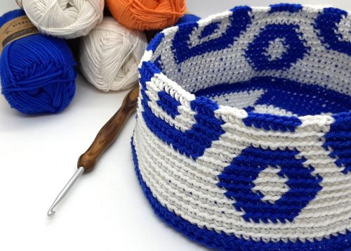 Zunächst etwas Wissenswertes über die Technik: Wir häkeln die Tasche in der Faire Isle Technik, d.h. wir häkeln mit zwei oder mehr Farben gleichzeitig. So entstehen unterschiedliche Farbmuster. Es wird nach einer Mustervorlage gearbeitet. Oft taucht diese Technik auch unter Tapestry auf. Tapestry ist weben. Es gibt diese Taschen auch gewebt. Meist werden sie in südamerikanischen Ländern hergestellt. Wir wollen die Tasche aber häkeln.