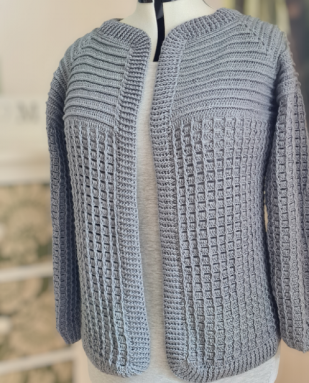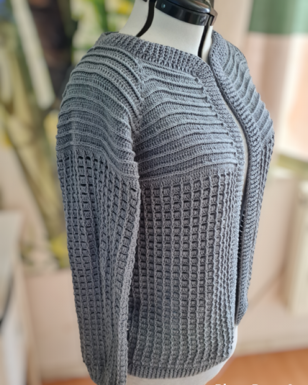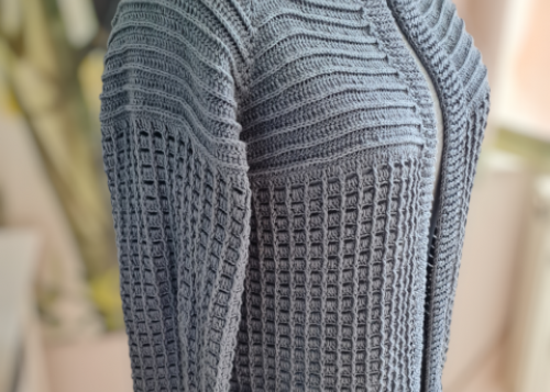Die Jacke wird an einem Stück von oben nach unten (RVO) gehäkelt. Lediglich die Ärmel und die Umrandung werden am Ende an den Cardigan gearbeitet.