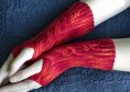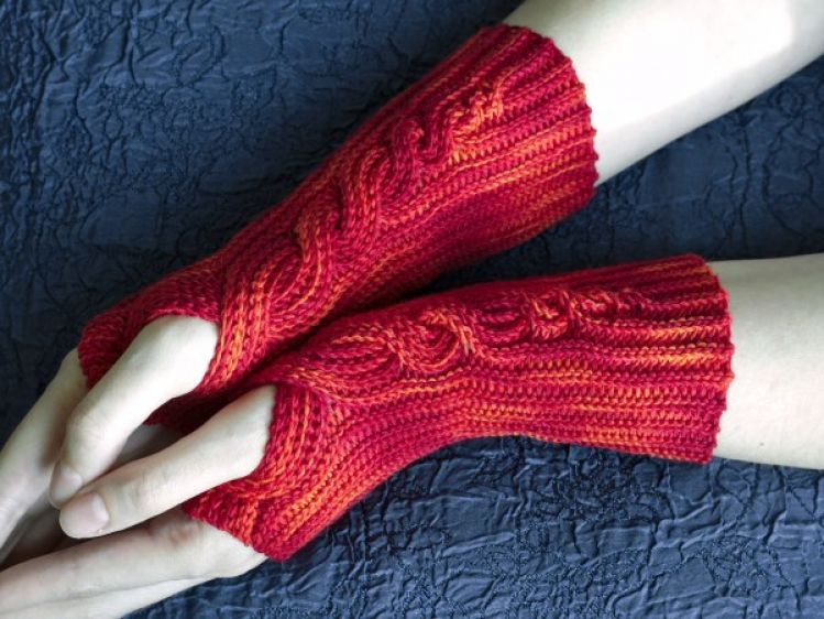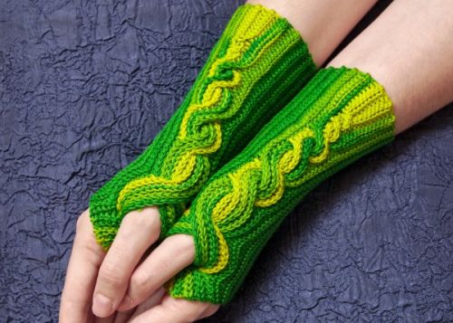 Diese eleganten Pulswärmer werden aus hinten eingestochenen Kettmaschen gearbeitet. Die Zöpfe werden horizontal gearbeitet - eine Technik, die ich erfunden habe.