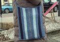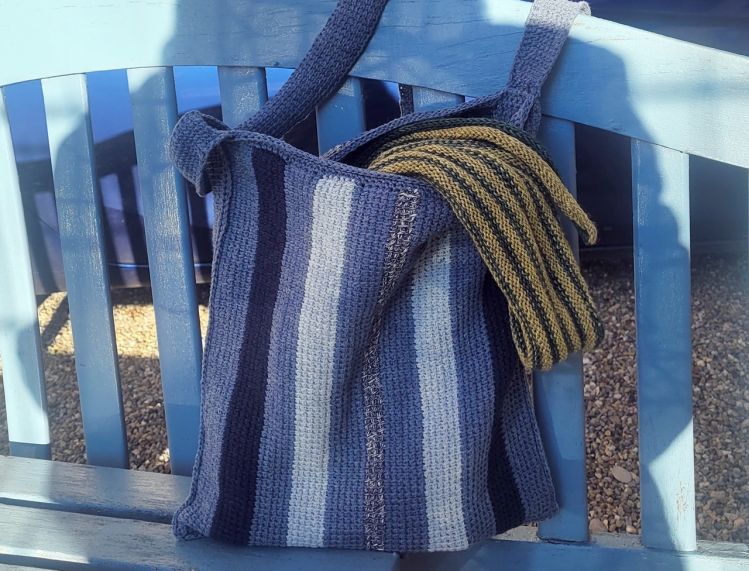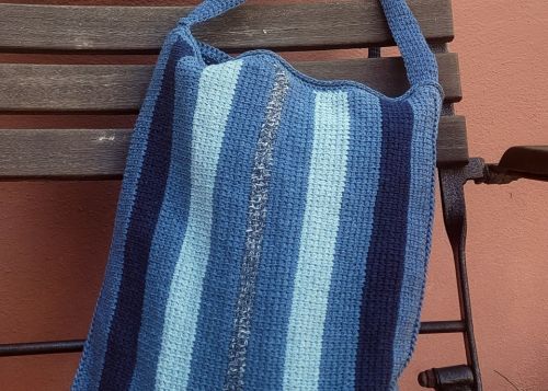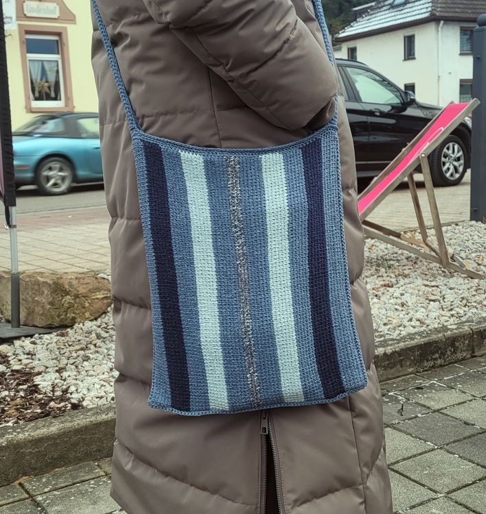 Aus dem Recycling Garn Denim von myboshi habe ich eine Umhängetasche gestaltet. Im tunesischen Grundstich, der Festigkeit garantiert und zudem in Längsstreifen einen coolen Look bietet. In 4 schönen Jeansfarben, gehäkelt mit einer tunesischen Häkelnadel Nr. 3,5 mit einem Seil.